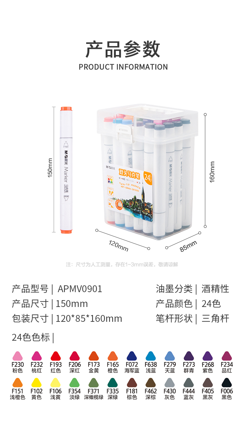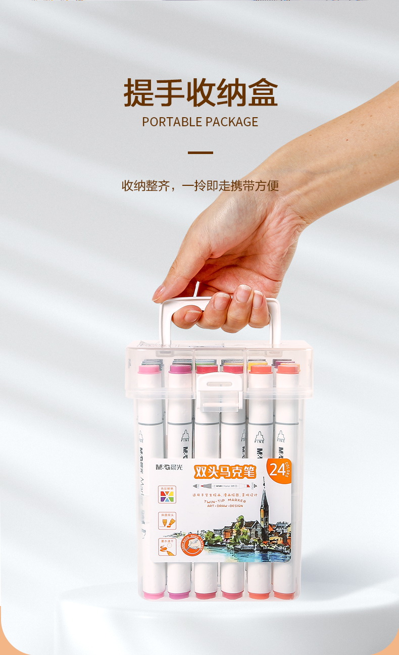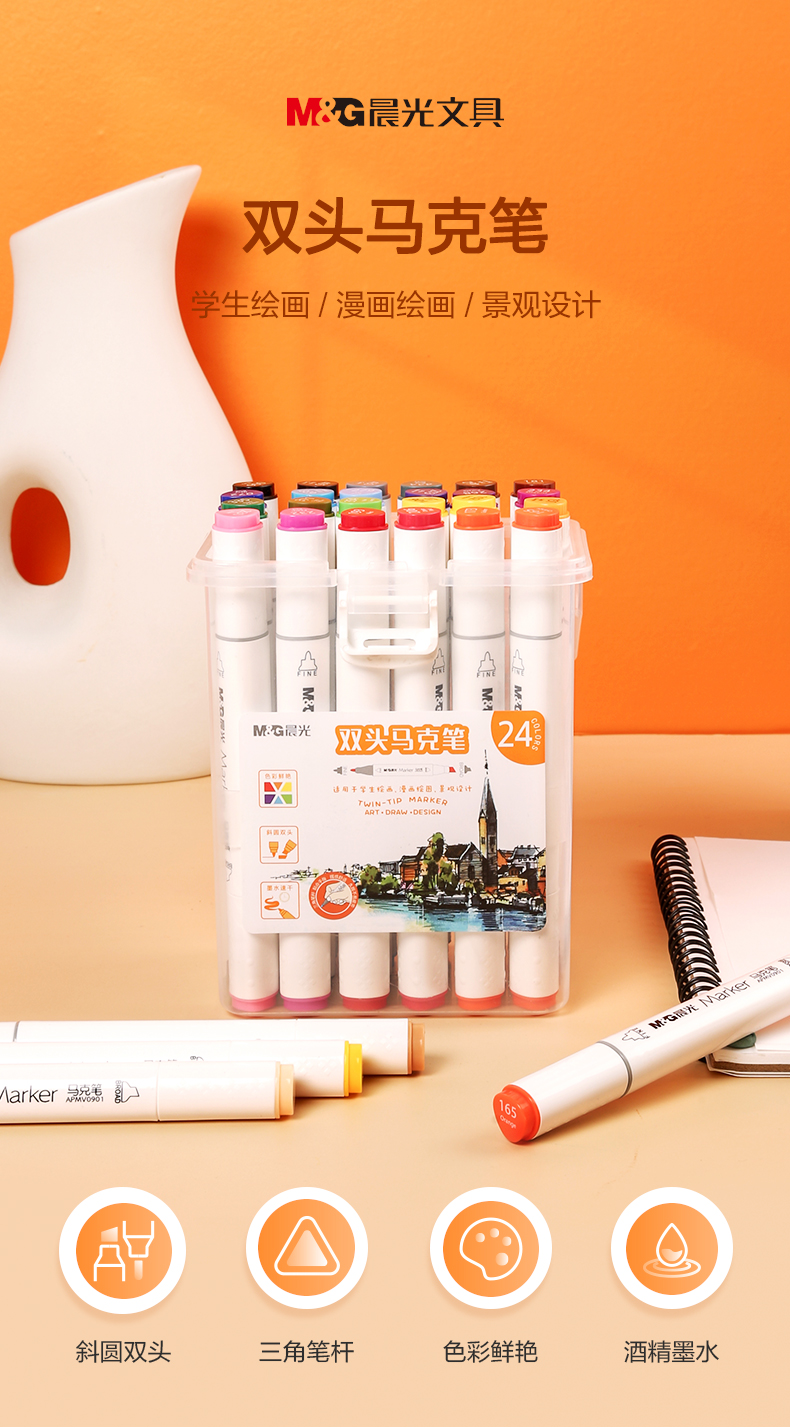 晨光(M&G)文具24色双头酒精性快干马克笔 纤维笔头水彩笔 绘画手绘涂鸦工具APMV0901 套 24色
