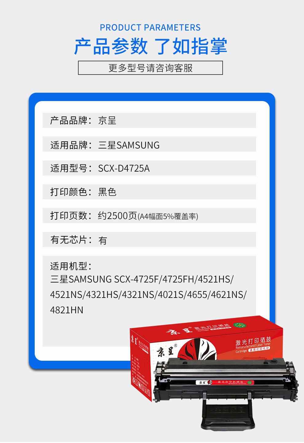 京呈适用三星SCX-4521HS硒鼓4321NS/HS D4725A 4650 4021打印机墨粉盒/支 D4725A专用碳粉/瓶 含芯片