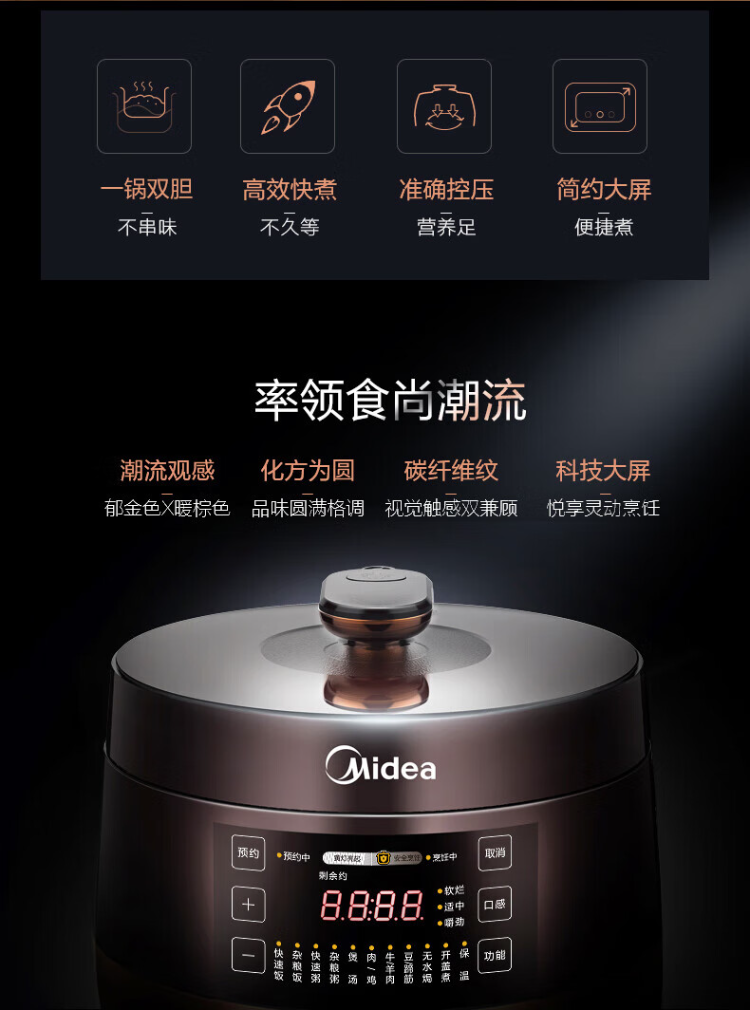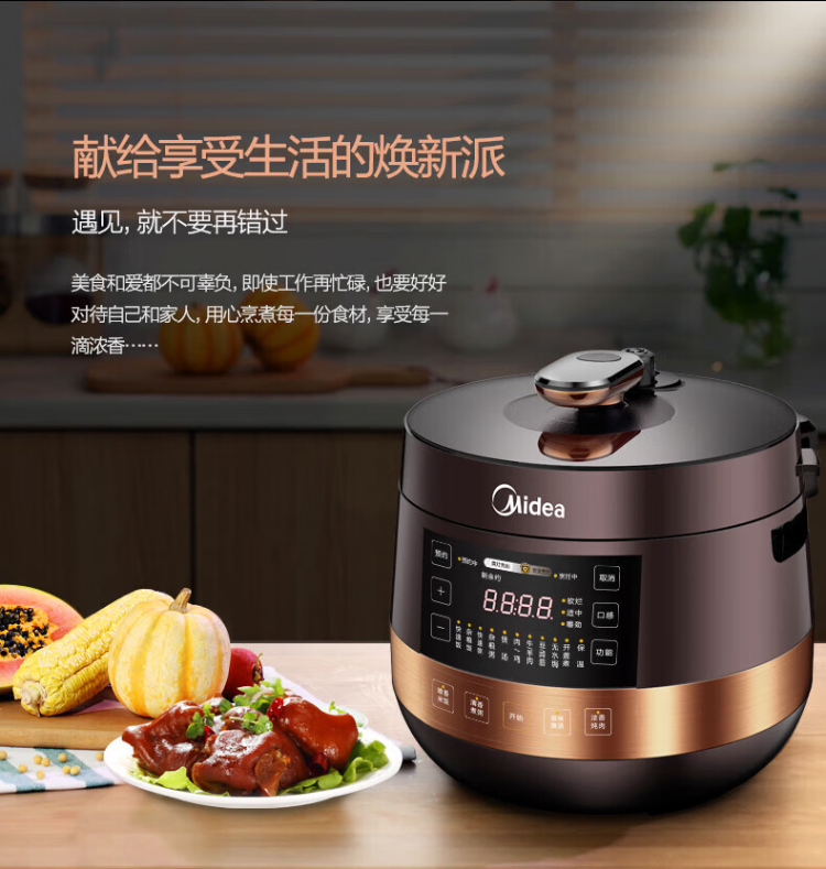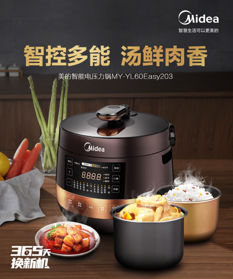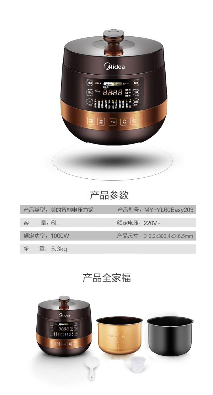 美的(Midea)电压力锅 MY-YL60Easy203 家用高压锅不粘双内胆电饭煲6L(单位:台) 棕色