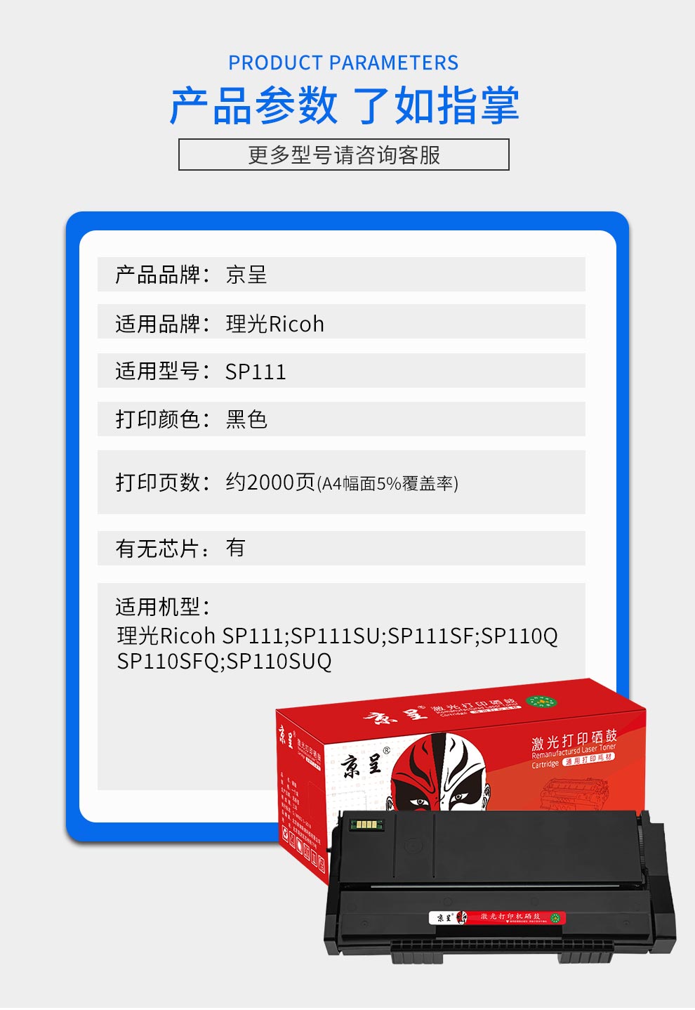 京呈 适用理光SP111硒鼓SP110墨粉SP111SU SP111SF碳粉SP110C打印机墨盒/支 【2000页】SP111 黑色硒鼓1支装