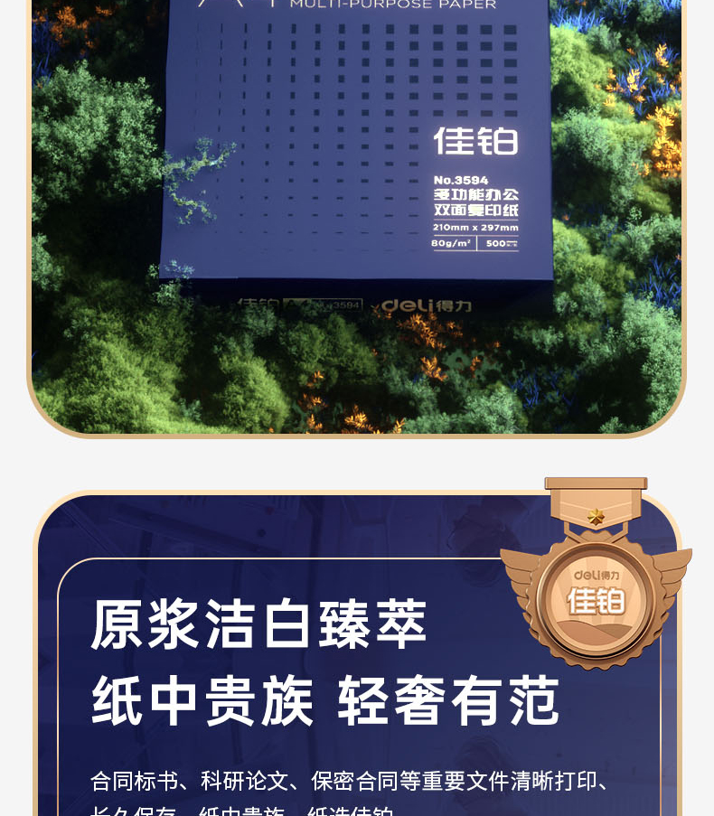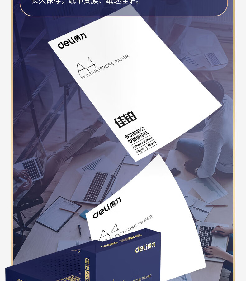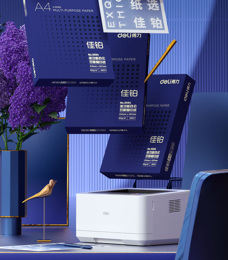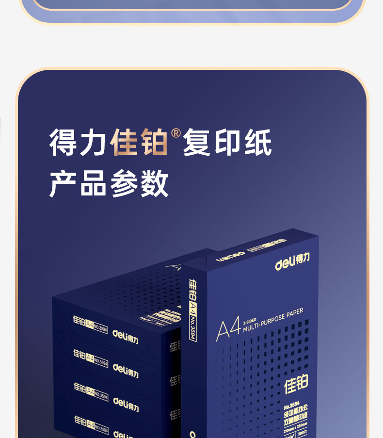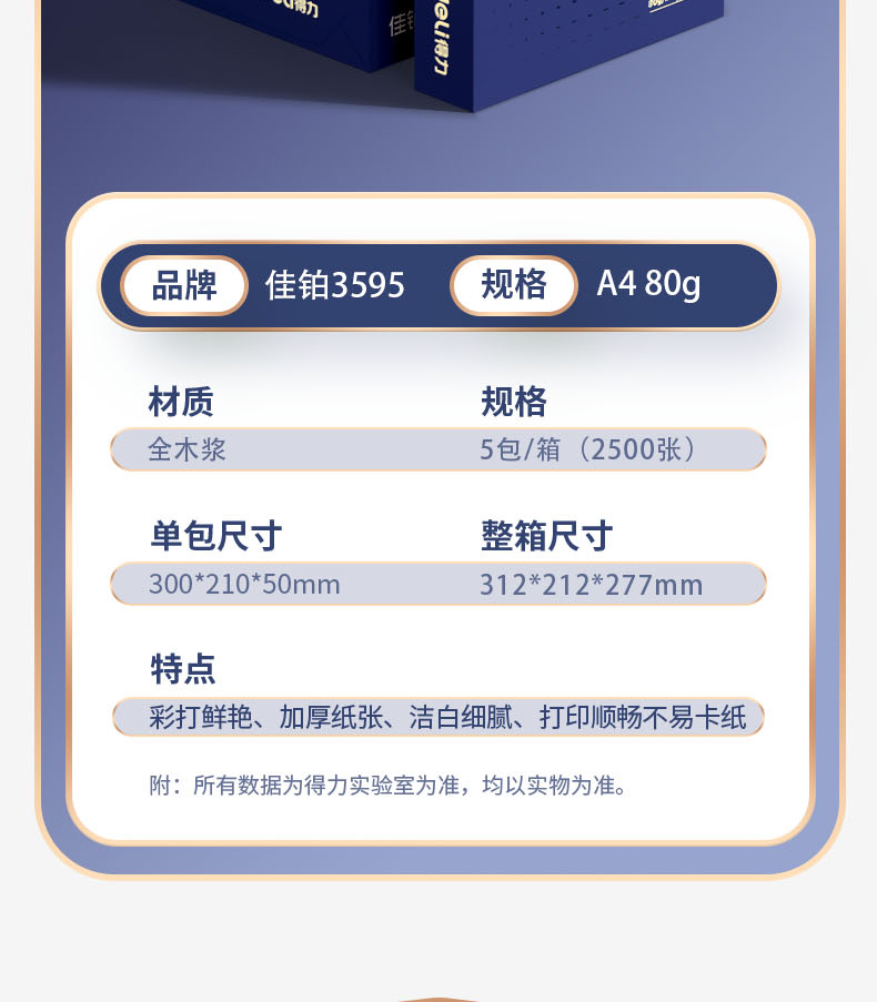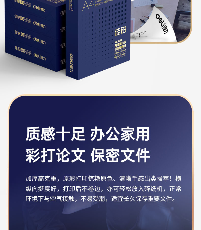 得力(deli)佳铂A4打印纸 80g克500张*5包一箱 高档加厚复印纸 合同标书彩打纸 3595 5包一箱 整箱2500张 白色