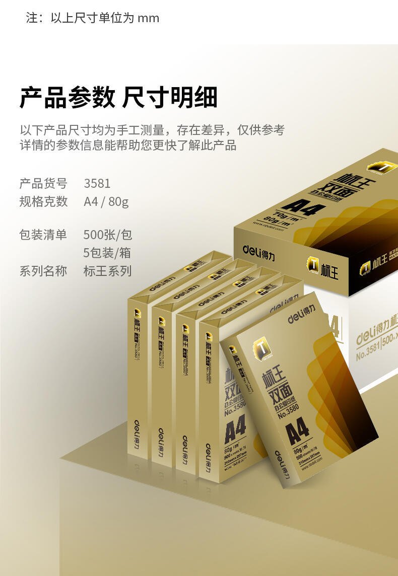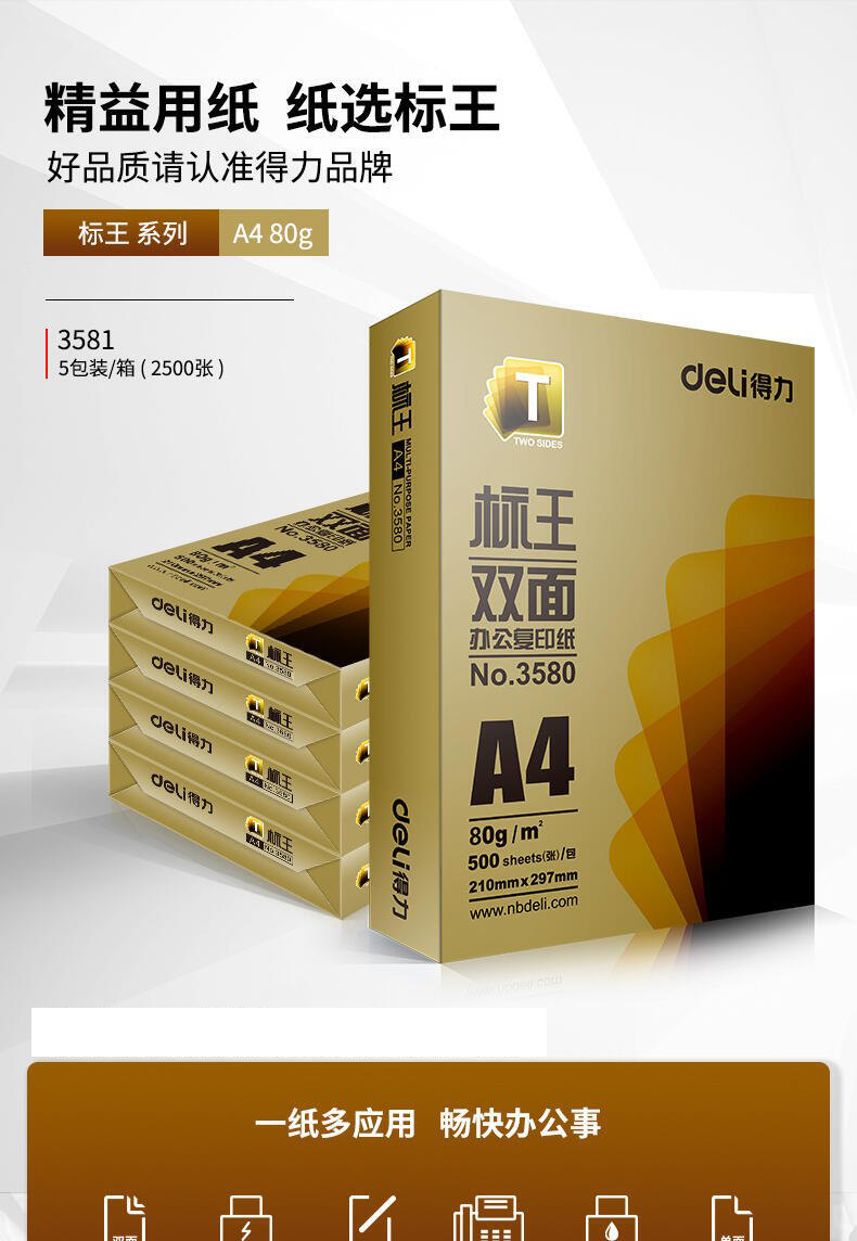 得力3581标王双面复印纸打印纸合同标书纸 (A4-80g-5包)(包) 一箱 (2500张) 白色