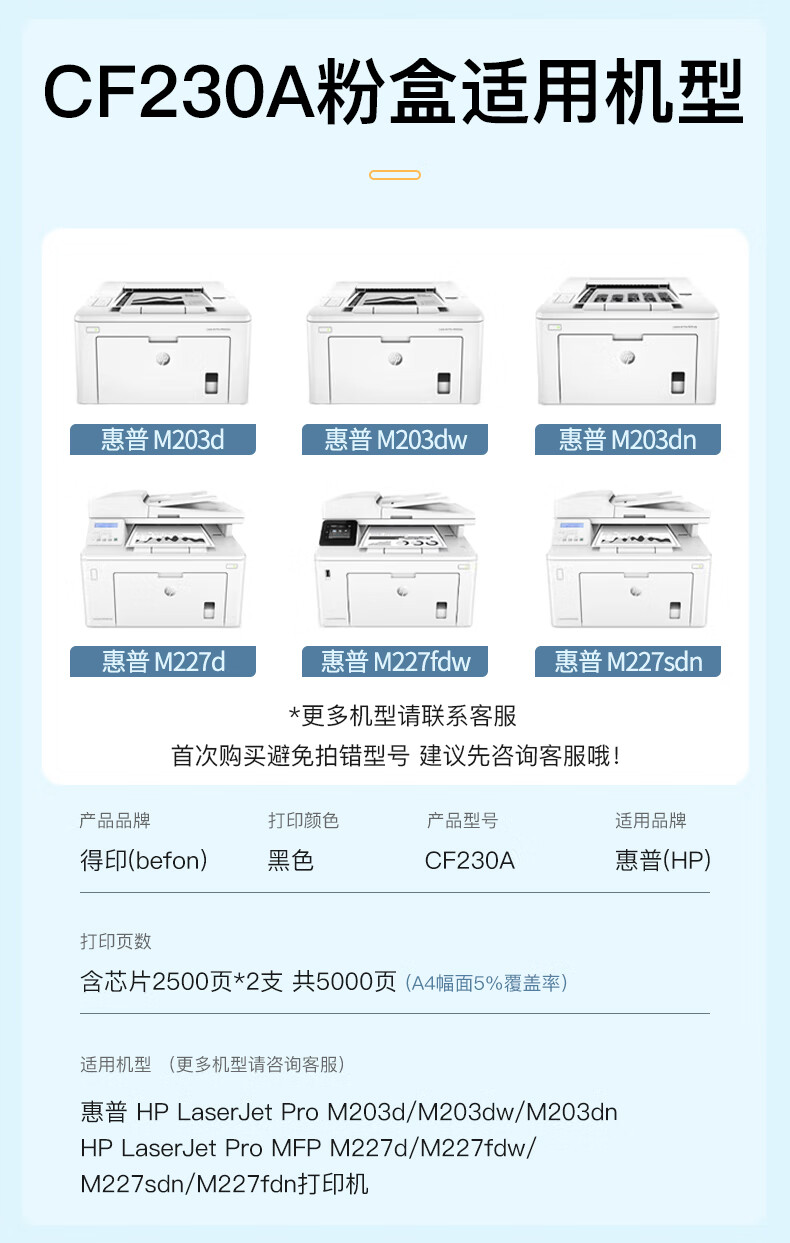 得印CF230A粉盒易加粉2支装适用惠普m227fdw硒鼓m203dw m203dn单位:套 黑色