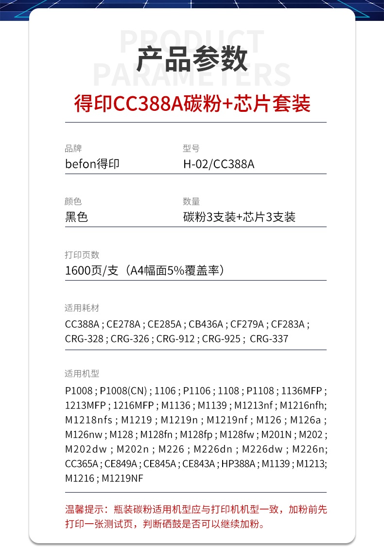 得印HP-02/CC388A碳粉+芯片三组装 适用惠普 m113 p1108 p1106单位:套 HP-02碳粉+芯片*3
