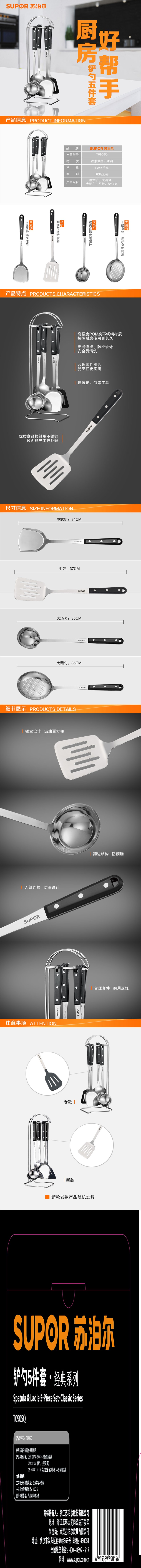 苏泊尔(SUPOR)铲勺5件套.经典系列/T0905Q(中式铲+平铲+大汤勺+大漏勺+铲勺架)/套 黑色