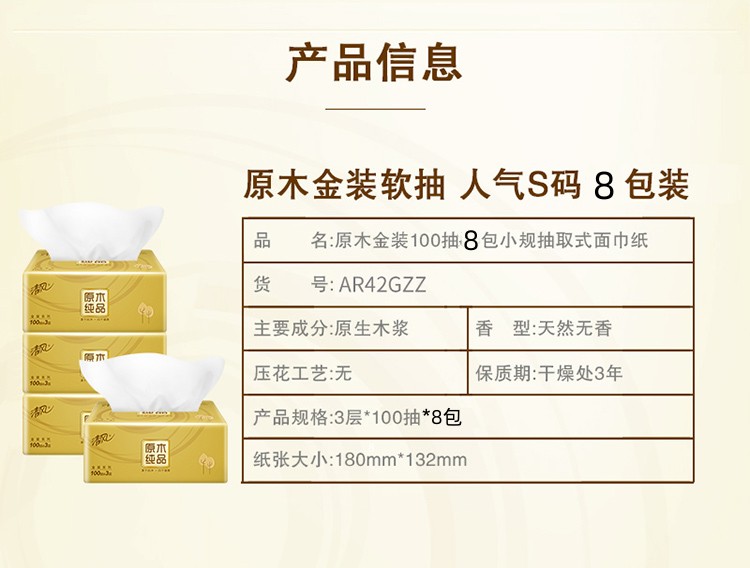 清风原木金装系列抽纸3层100抽8包装AR42GZZ-2T 白色
