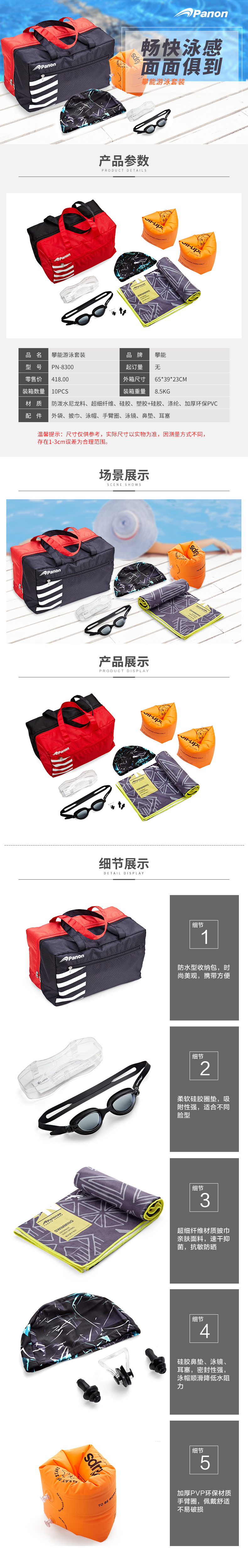 攀能游泳套装 游泳包(收纳包/披巾/泳镜鼻夹耳塞/泳帽/手臂圈)/套 黑红色