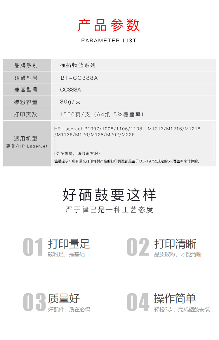 标拓 BT-CC388A 打印量1500页 适用惠普hp1108/p1106/1007 硒鼓 1.00 只/支 (计价单位:支) 黑色
