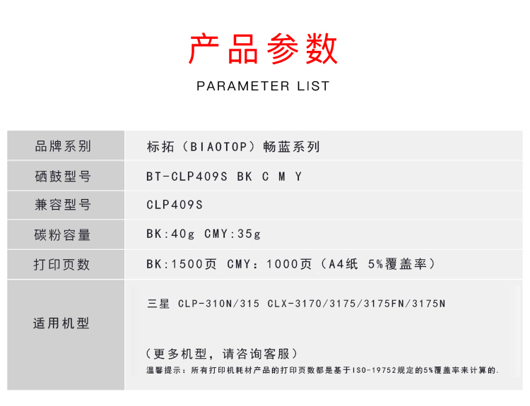 标拓 BT-CLP 409S Y 打印量1000页 适用三星CLP-310N/315 硒鼓 1.00 只/支 (计价单位:支) 黄色