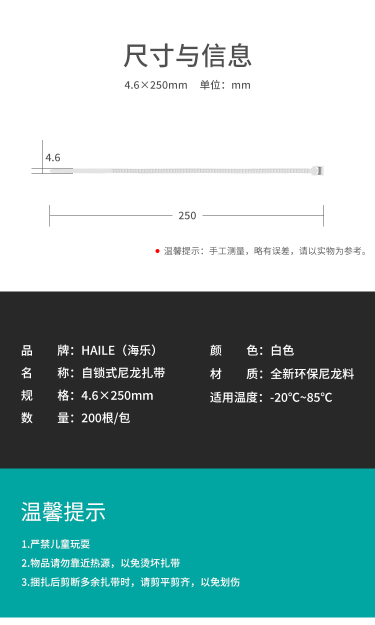 海乐(Haile)扎带 尼龙扎带 多功能透明理线带 自锁式阻燃扎带 4.6*250mm 白色200根ZD-25-200 白色