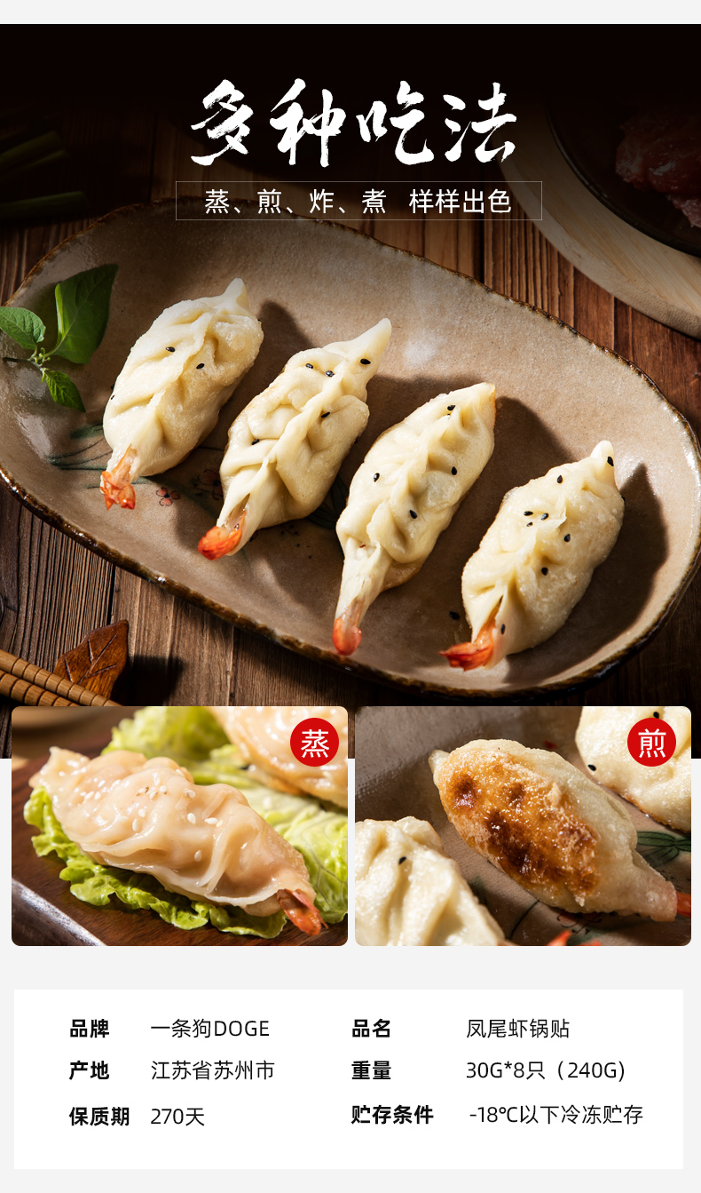 一条狗美味凤尾虾锅贴煎饺蒸饺速冻饺子速食方便早餐面点凤尾虾锅贴240g/盒*3盒(8只装×3盒) 莓果色