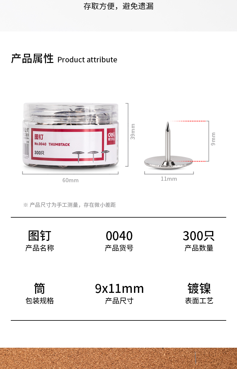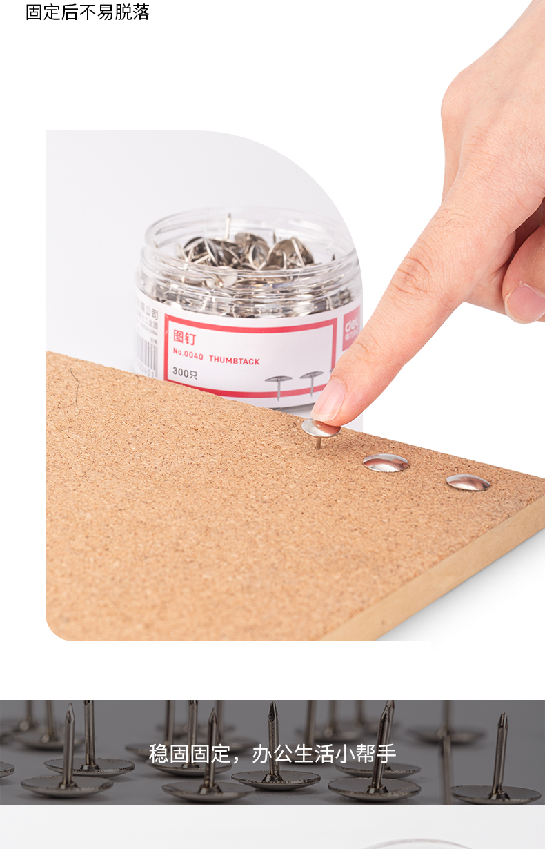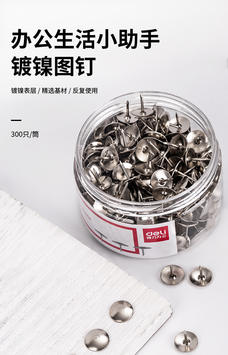 得力(deli)镀镍图钉 软木板按钉 照片钉 300枚/筒 0040【5筒装】 不锈钢色