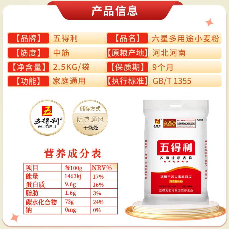 五得利(WUDELI) 面粉 六星多用途小麦粉 2.5kg(单位:袋) 白色