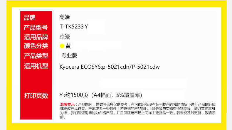 高端TECH-A T-TK5233Y粉盒专业版黄色适用Kyocera ECOSYS:p-5021cdn/P-5021cdw 黄色