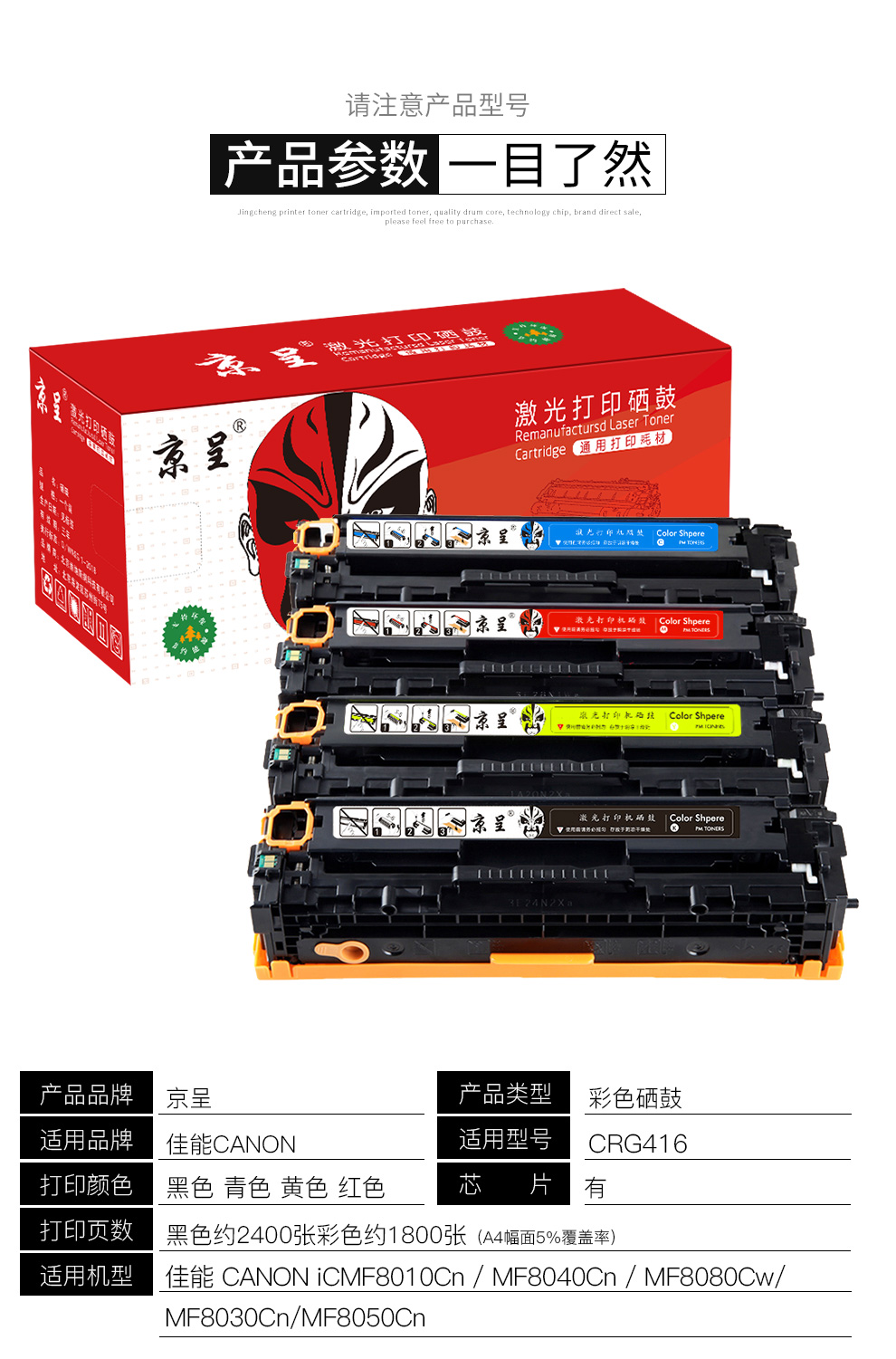 京呈CRG416硒鼓适Canon佳能MF8080Cw/MF8050Cn粉盒MF8010cn打印机墨盒 碳粉四色套装(含芯片)/套