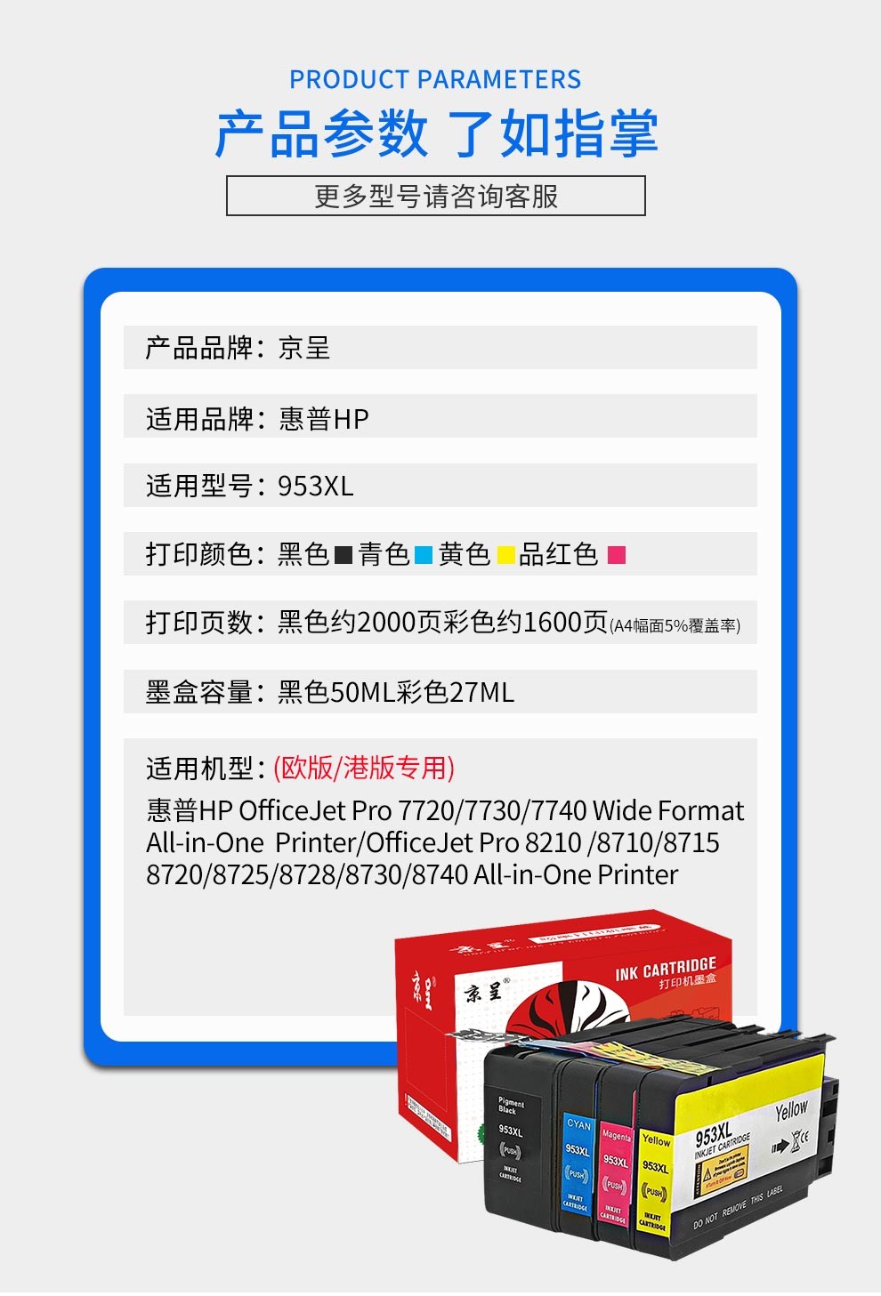 京呈适惠普HP953XL墨盒7730 8210 8216 8710 8730 8740 7740粉盒/支 欧版/港版专用】953XL 青色墨盒