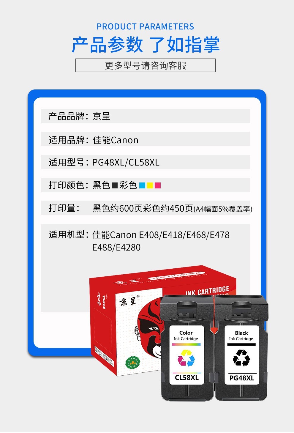 京呈适用佳能E478彩色PG48 CL58黑色墨盒佳能E408 E418 E468 E488墨盒 PG48XL CL58XL墨盒大容量/套