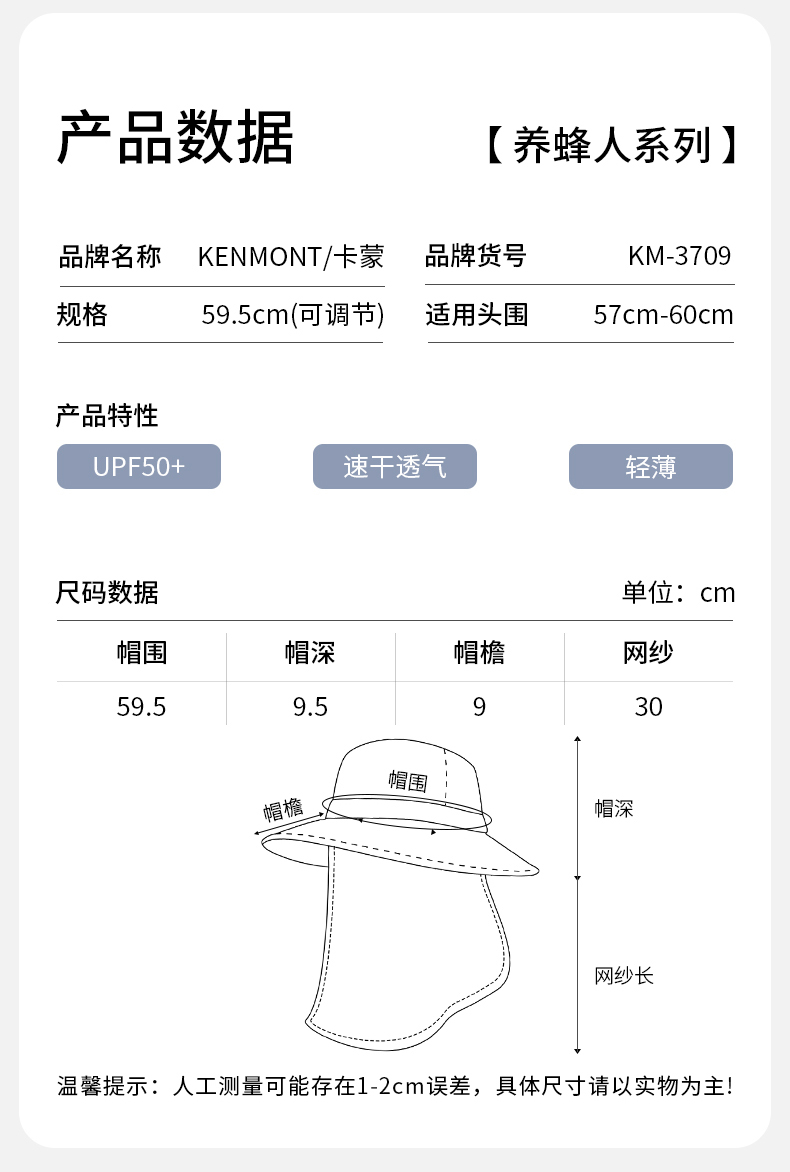 卡蒙(Kenmont) KM-3709 59.5cm(可调节) 轻薄速干透气防晒帽 09深灰色(单位:顶)