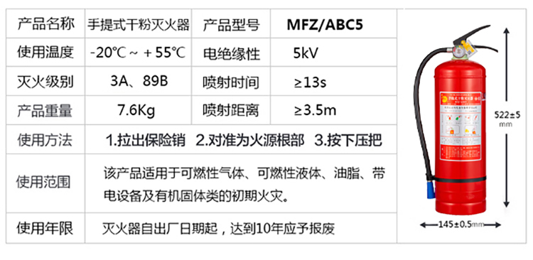 神龙 手提式干粉灭火器5公斤 车载家用及商用灭火器5kg MFZ/ABC5 消防器材 红色