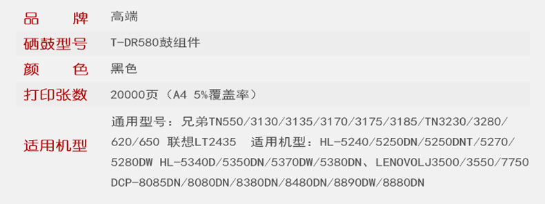 高端 T-DR580鼓组件 打印量20000页 适用兄弟DCP-8060 8065DN 8070D DR-580 硒鼓 1.00 只/个 (计价单位:个) 黑色