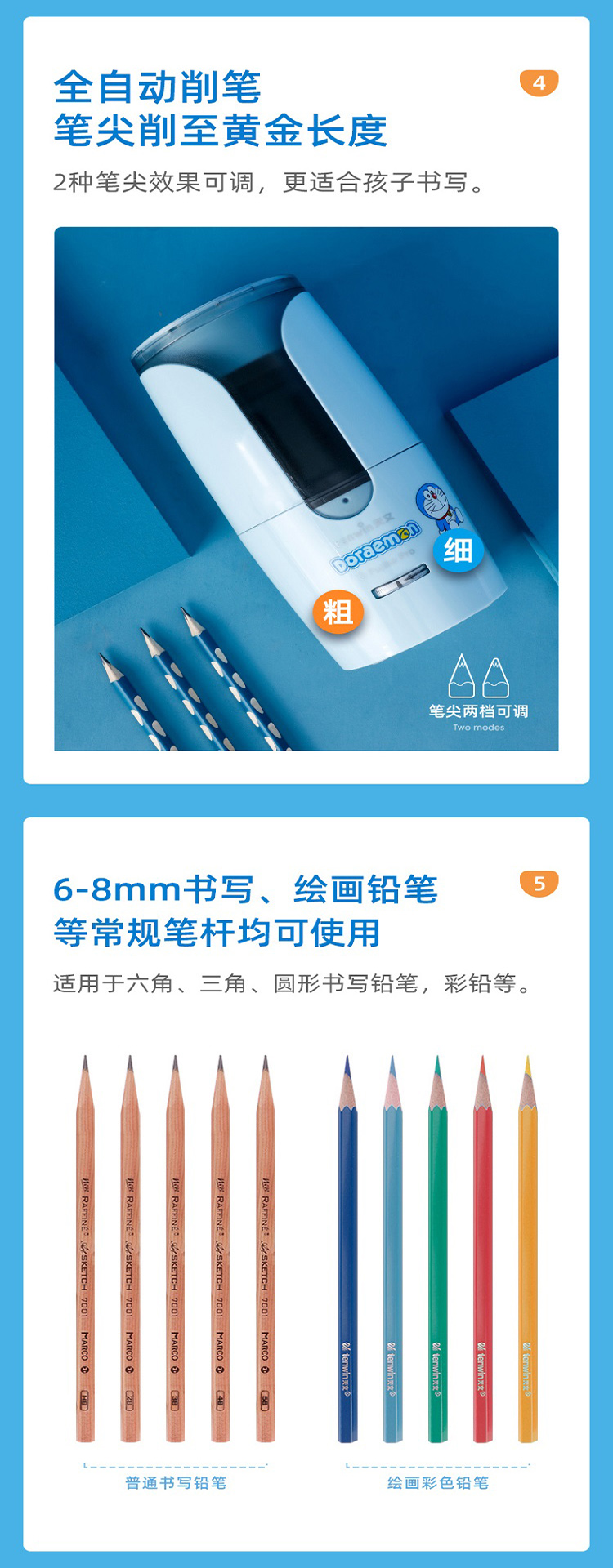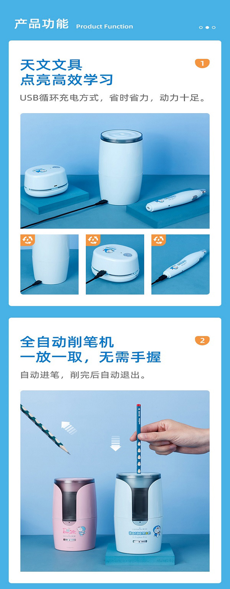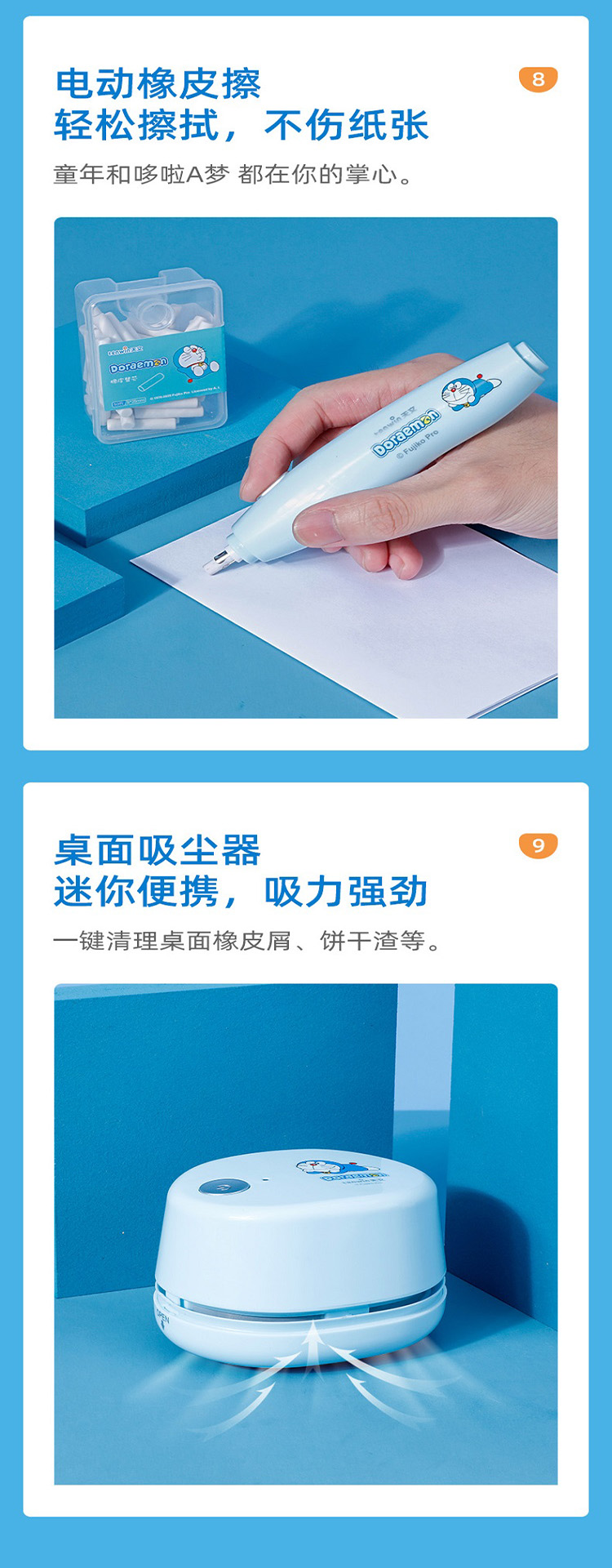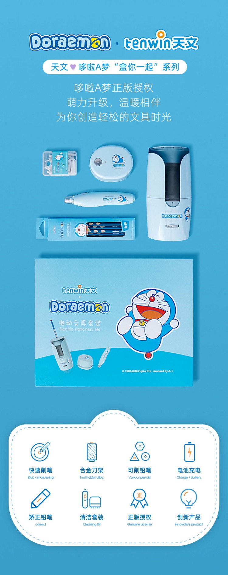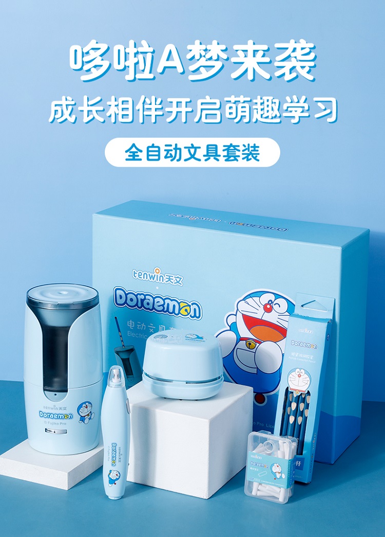 天文小学生开学礼盒套装儿童节礼物哆啦A梦联名电动文具套装 电动转笔刀橡皮擦吸尘器铅笔礼盒5件套 A8096 蓝色