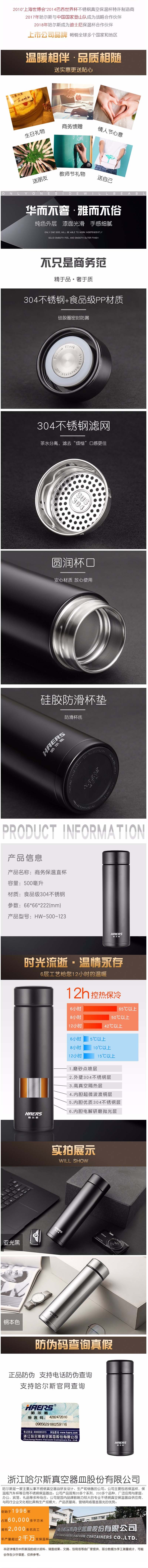 哈尔斯 商务保温直杯500ml HW-500-123(单位:个) 黑色