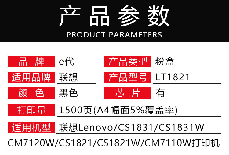 e代经典 LT1821粉盒黑色 适用联想CS1831 1831W硒鼓CS1821W墨盒CM7120W碳粉CM7110W打印机墨粉盒/个 黑色