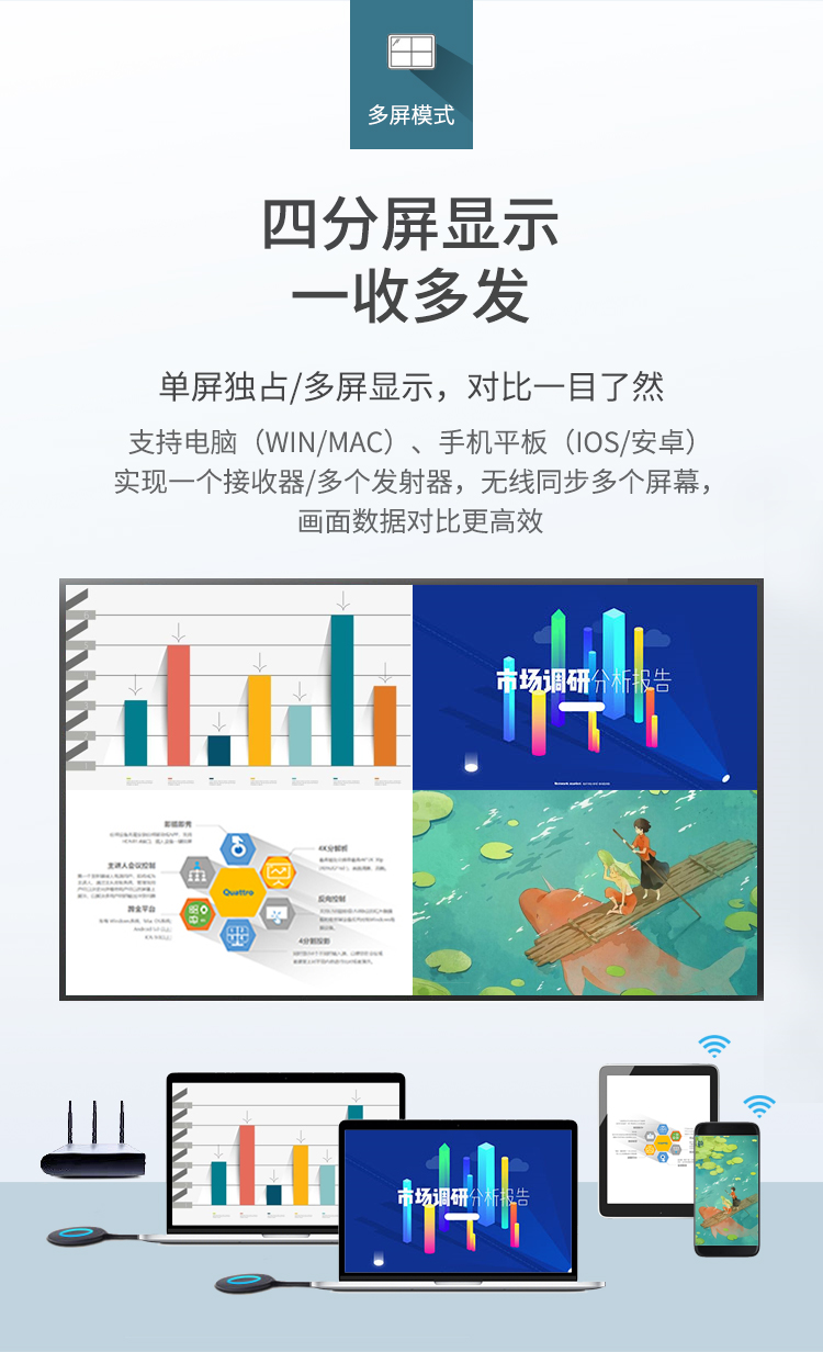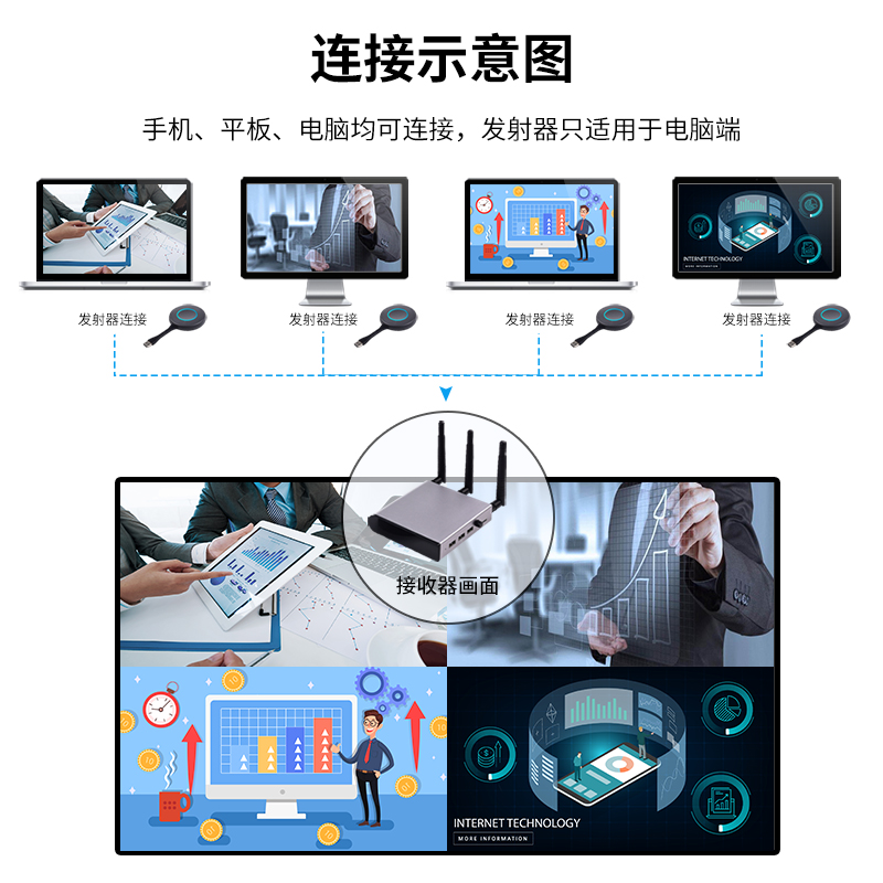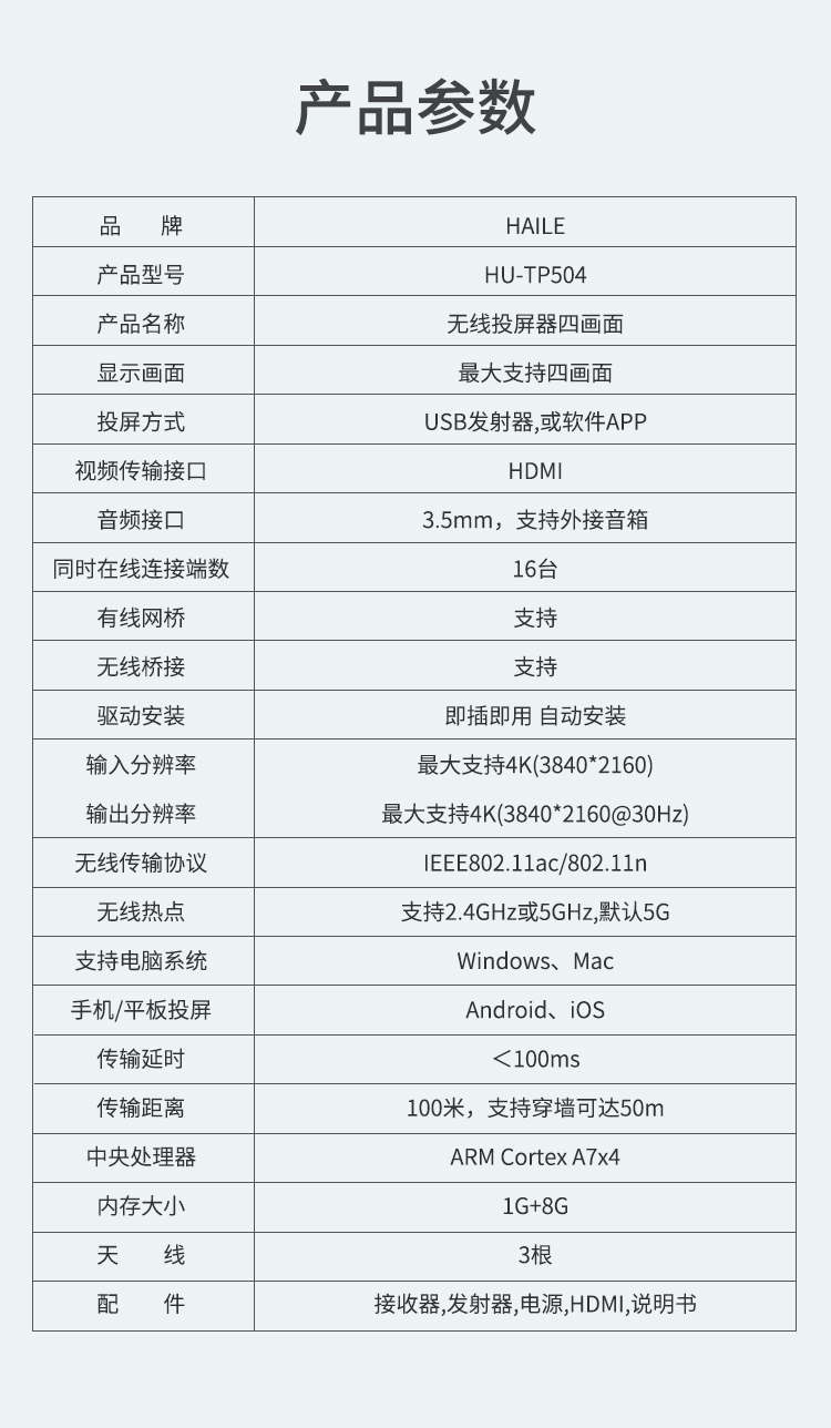 海乐(Haile)企业级无线四设备投屏器 HDMI传输器分辨率3840*2160 4K视频同屏投影传输100米 HU-TP504 黑色