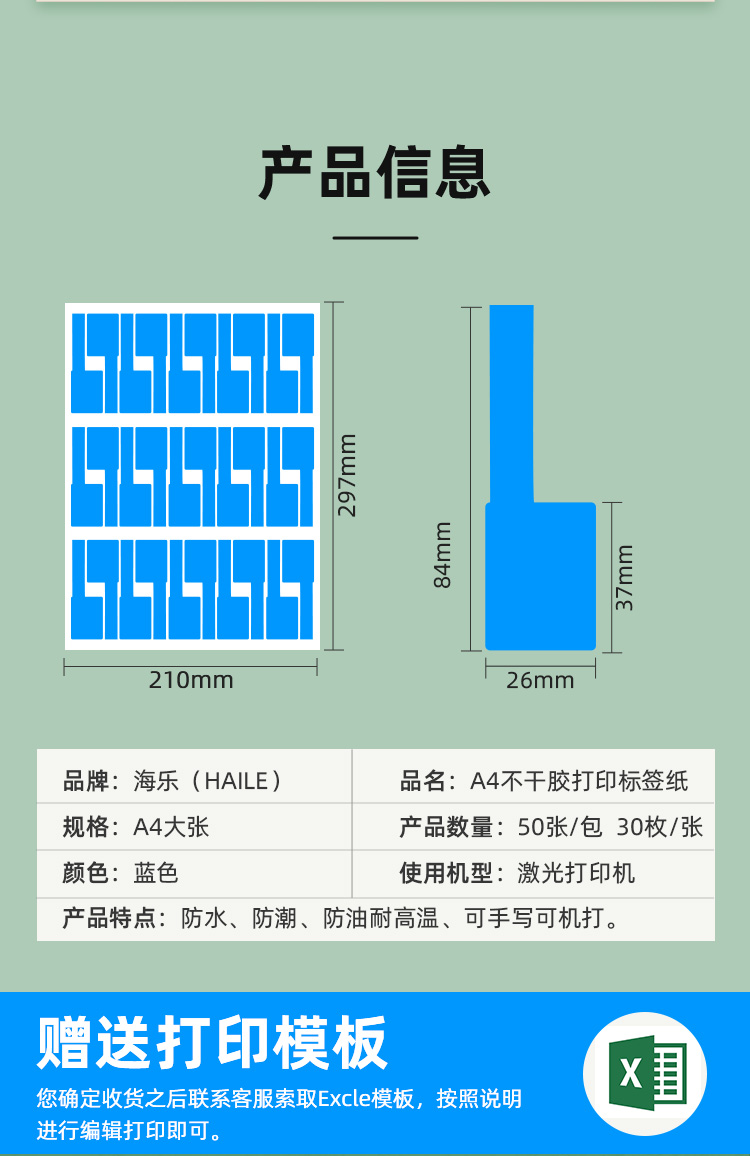 海乐(Haile)A4不干胶打印标签纸 机房网络布线贴纸 线缆标签纸 P型蓝色BQ-PF 50张/包 水蓝色