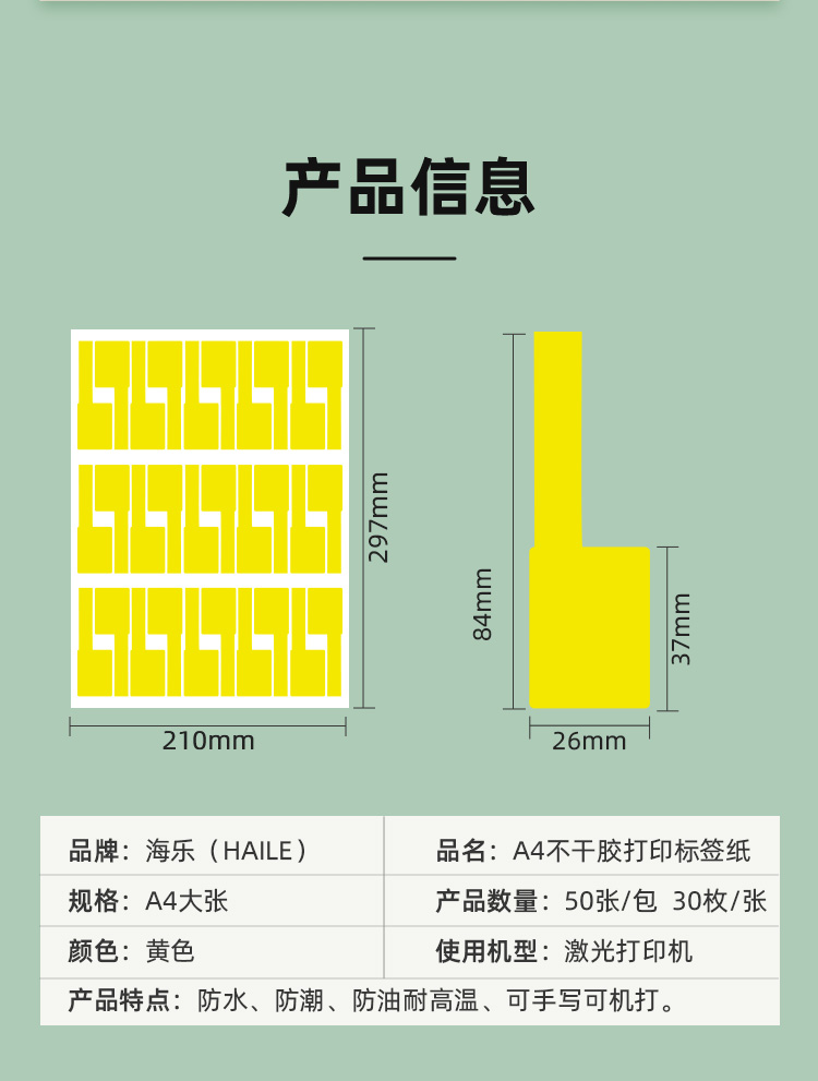 海乐(Haile)A4不干胶打印标签纸 机房网络布线贴纸 线缆标签纸 P型黄色BQ-PC 50张/包 黄色