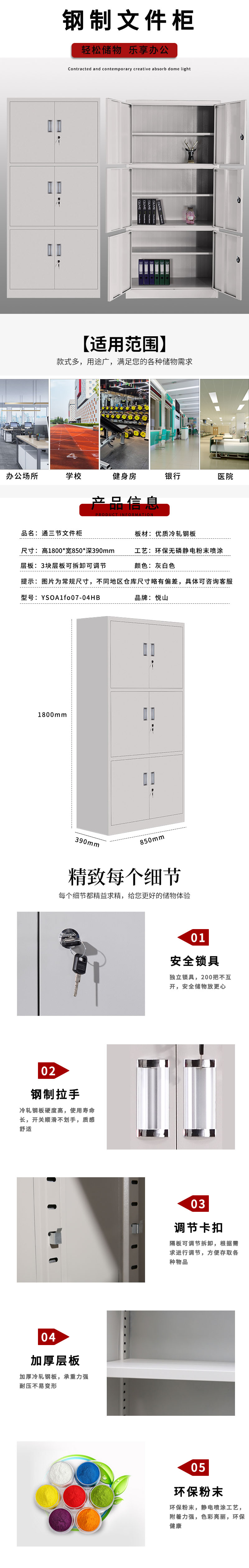 悦山 办公钢制储物柜员工柜 通三节文件柜 常规款850*390*1800*1台 灰白色