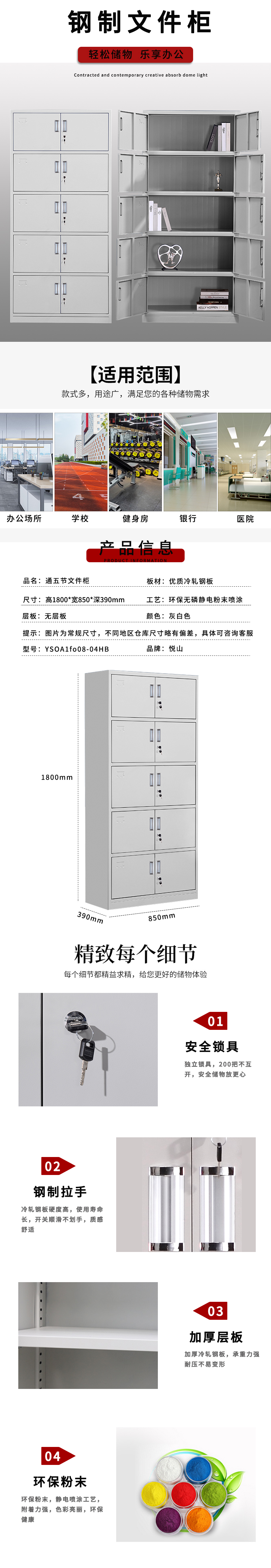 悦山 文件柜凭证档案柜 通五节文件柜 常规款850*390*1800*1台 灰白色