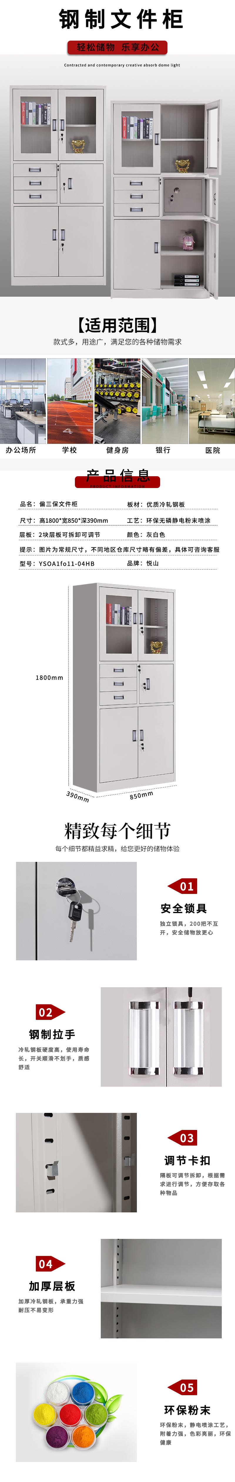 悦山 钢柜储物柜 偏三斗文件柜 常规款850*390*1800*1台 灰白色
