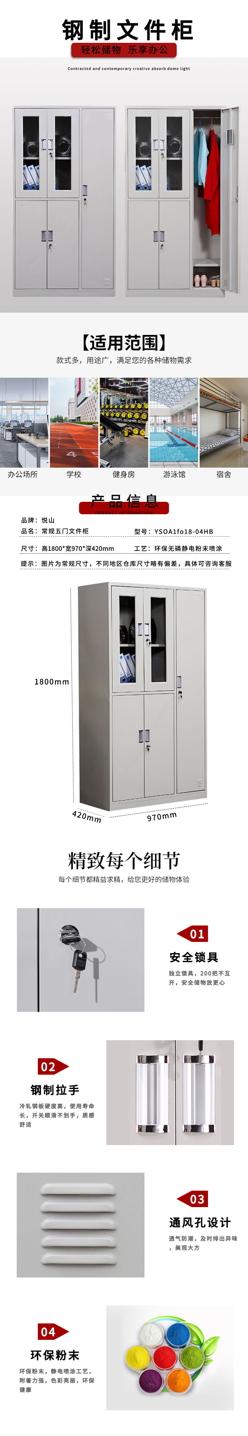 悦山 钢柜储物柜 5门柜 常规款970*420*1800*1台 灰白色