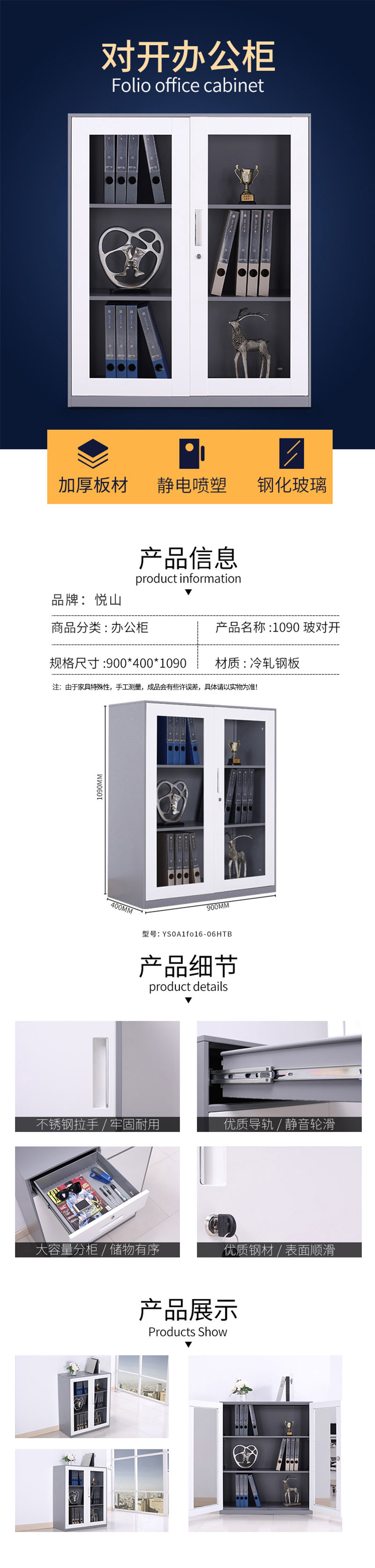 悦山 玻璃门矮柜文件柜资料档案柜900*400*1090*1台 灰+白