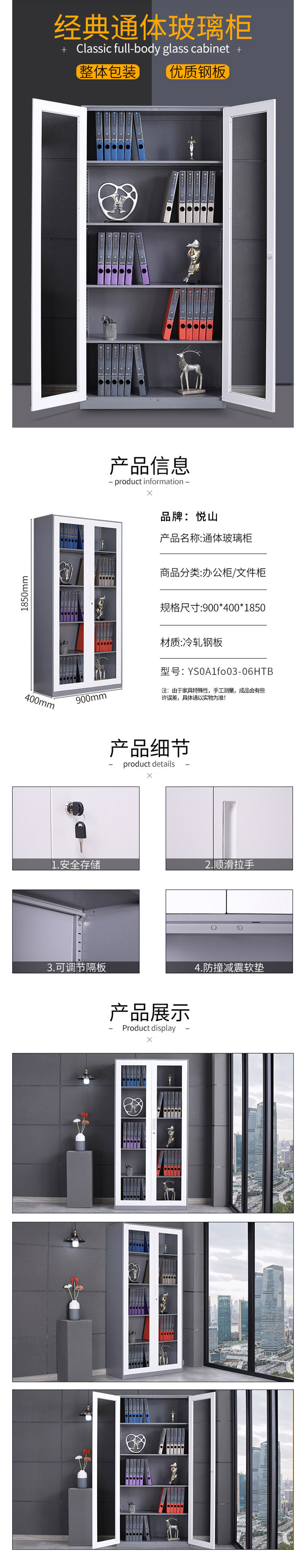 悦山 通体玻璃柜文件柜铁皮柜钢制办公柜档案柜900*400*1850*1台 灰+白