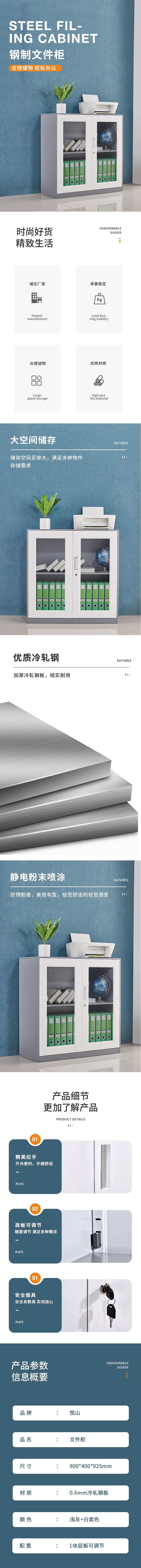 悦山钢制文件柜 玻璃门925矮柜900*400*925*1台 浅灰+白