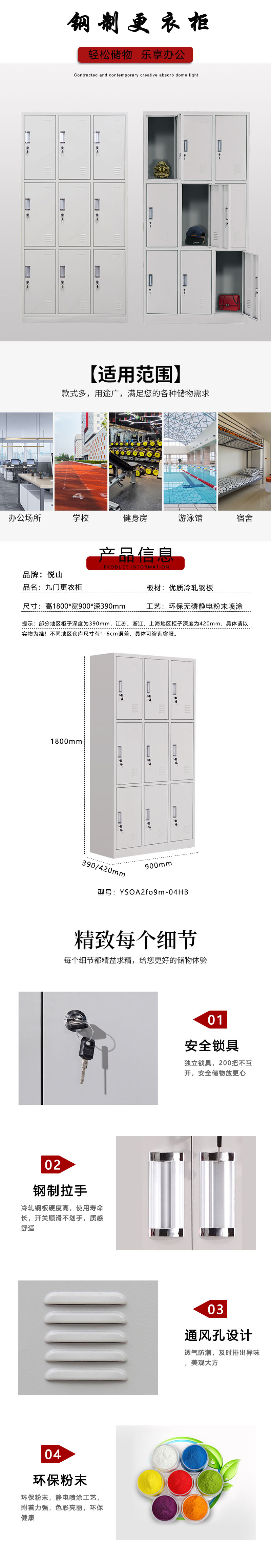 悦山铁皮柜储物更衣柜 9门更衣柜 常规款 900*390*1800 *1台 灰白色