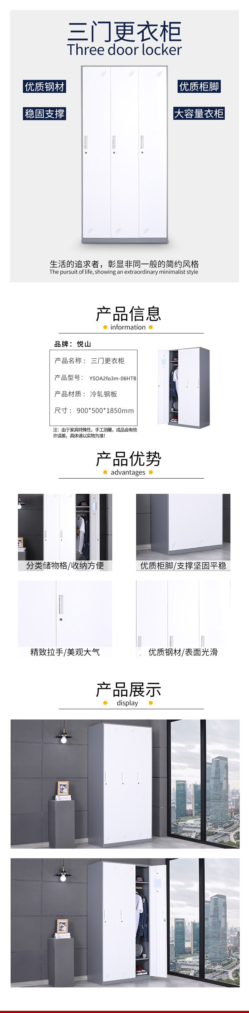 悦山 三门更衣柜员工柜办公室柜子900*500*1850*1台 灰套白