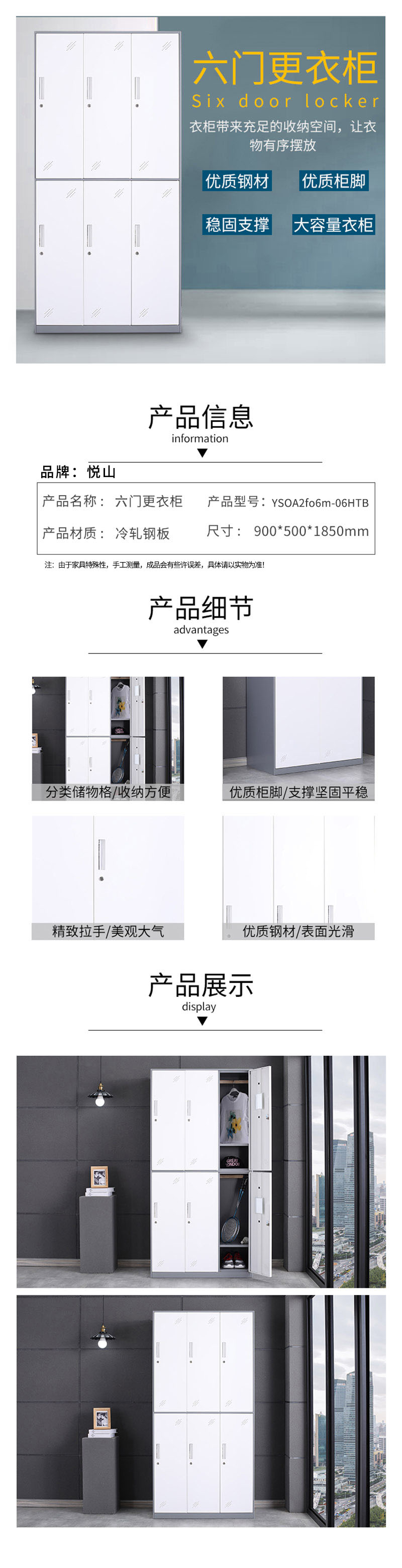 悦山 六门更衣柜员工柜办公室柜900*500*1850*1台 灰套白