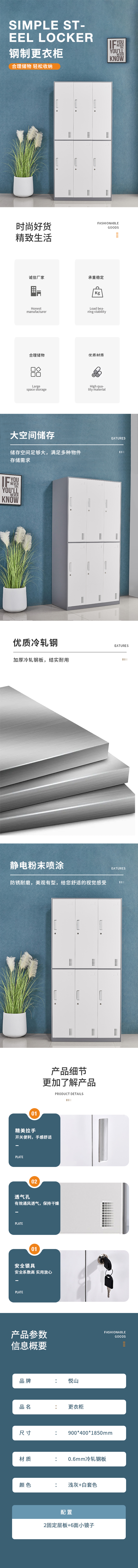 悦山钢制更衣储物柜 六门更衣柜 900*400*1850mm*1台 浅灰套白色