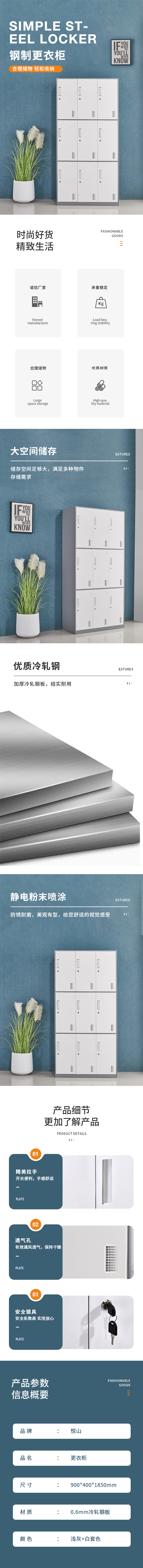 悦山钢制更衣储物柜 九门更衣柜 900*400*1850mm*1台 浅灰套白色