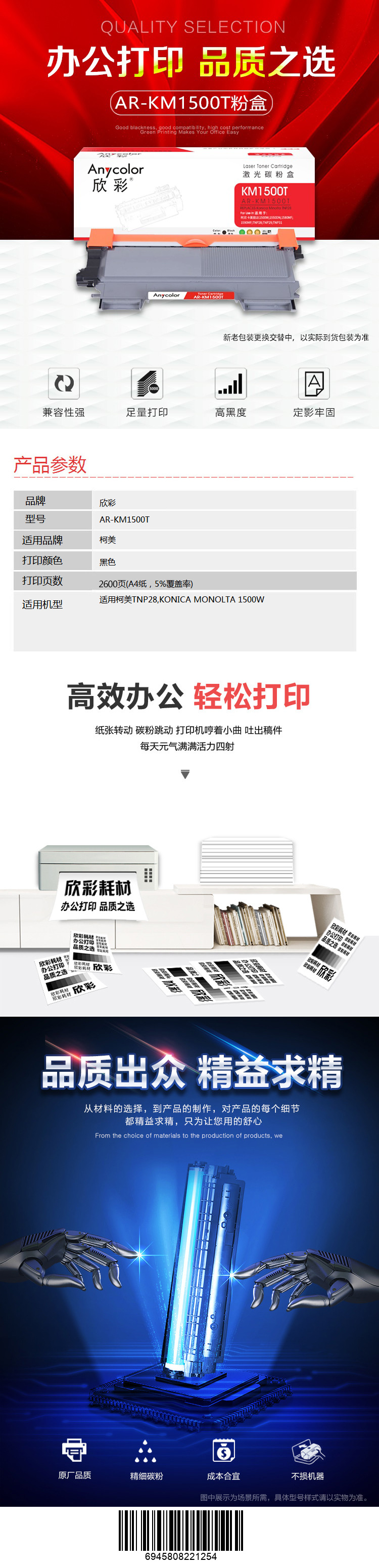 欣彩AR-KM1500T粉盒适用柯尼卡美能达bizhub TNP28 15 16 12P 1500W 1550dn 1590 1580mf 单位:支 起订量1支 黑色