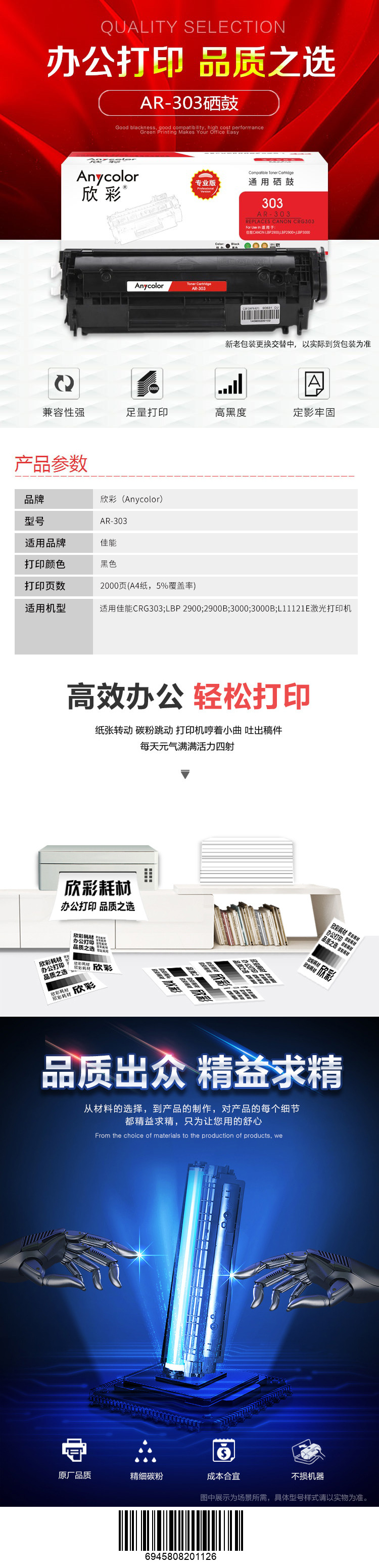欣彩(Anycolor) AR-303 专业版 打印量2000页 碳粉盒 1.00 只/支 (计价单位:支) 黑色