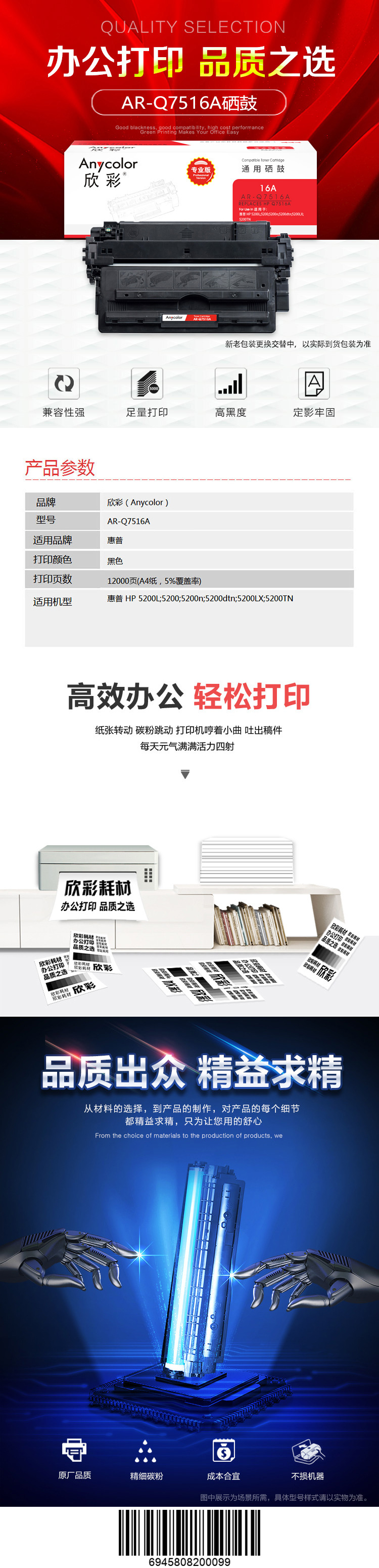 欣彩(Anycolor) AR-Q7516A专业版硒鼓 16A 适用惠普HP 5200 5200n 5200LX 打印机耗材(单位:支) 黑色