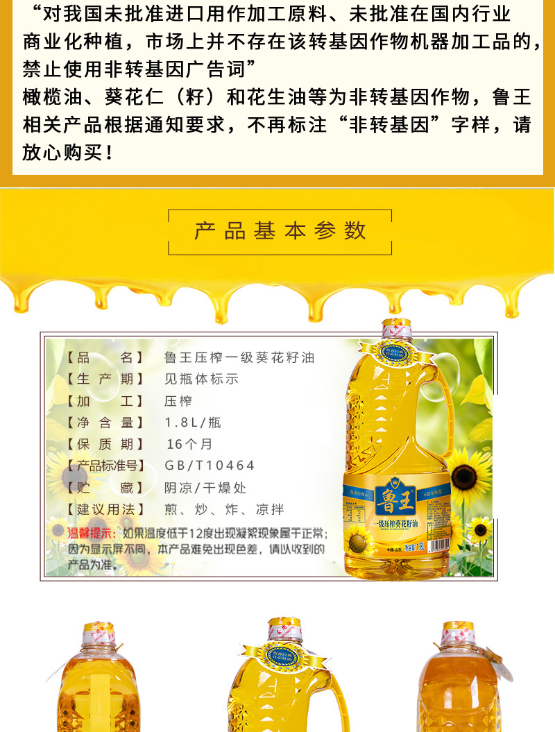 鲁王一级压榨葵花油 宝石蓝 1.8L*2