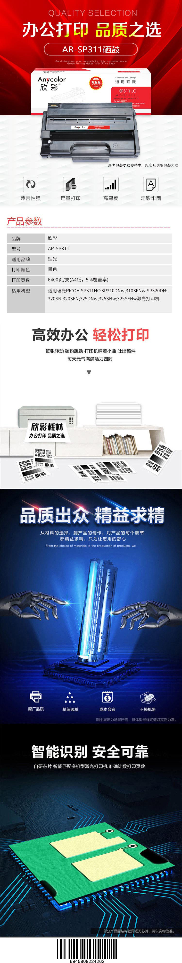 欣彩AR-SP311硒鼓 专业版 适用理光RICOH SP311LC SP310DNw 310SFNw SP320DN 320SN 320SFN 325DNw激光打印机(单位:支) 黑色