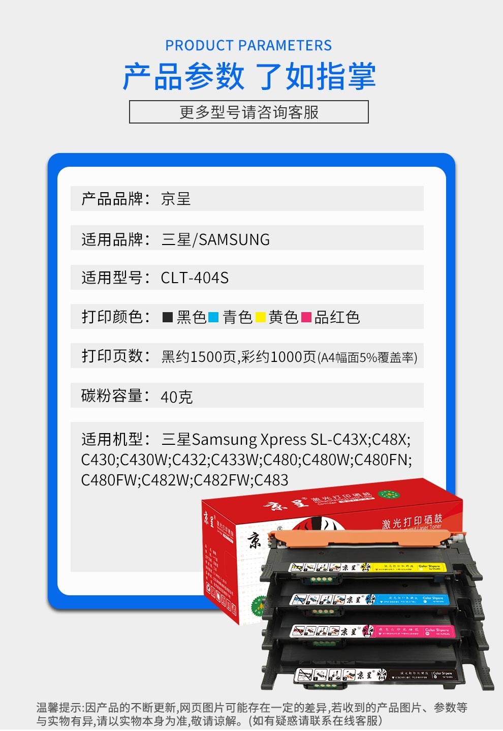 京呈CLT-K404S硒鼓适用三星C430粉盒C430W C480W硒鼓480FW墨盒C480FN/套 CLT-404S粉盒四色套装-4500页
