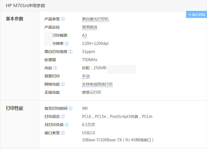 惠普(HP)黑白激光打印机M701n标配 台 黑色