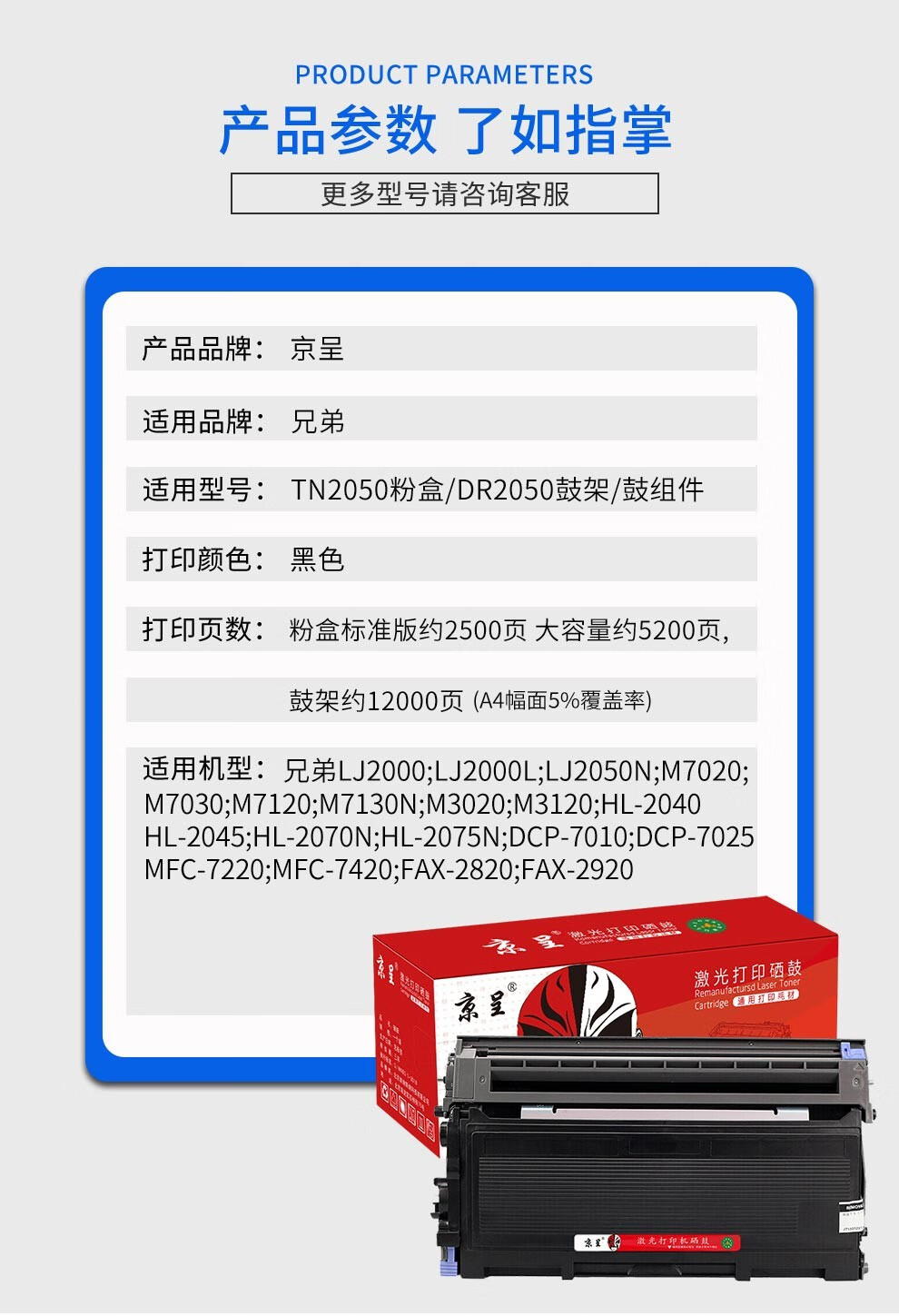 京呈TN2050粉盒适用兄弟DCP7010 Fax2820墨盒MFC7420打印机硒鼓HL-2040 TN2050 大容量粉盒/支